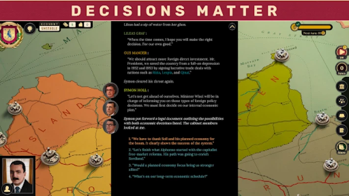 Ieniriet dziļi valstiskuma smalkajās niansēs, pārvaldot valsts budžetu, īstenojot reformas un pieņemot likumus, kas veidos jūsu nācijas nākotni. Sordlandā jums būs jāorientējas recesijas apstākļos, jāpieņem izšķiroši lēmumi par drošību, labklājību un diplomātiju, vienlaikus redzot, kā jūsu rīcība ietekmē ne tikai valsti, bet arī jūsu ģimeni un personīgās attiecības. Rīzijā jūs stāsieties pretī ģeopolitiskiem izaicinājumiem un jaunu resursu pārvaldībai, veidojot alianses vai iegūstot ienaidniekus starp jaunajiem nacionālajiem līderiem. Iesaistieties sarežģītās dinamikās ar dižciltīgajiem un izbaudiet kara mehāniku, stratēģiski stiprinot savus militāros spēkus, lai iebiedētu kaimiņus vai nodrošinātu mieru. Katrs stāsta posms piedāvā bagātīgas raksturu mijiedarbības un neskaitāmas iespējas veidot savu ceļu, kulminējot vairāk nekā 9 galvenos un 25 apakšbeigu scenārijos Sordlandā, kā arī neskaitāmos rezultātos Rīzijā.