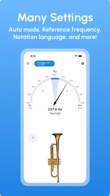 Šis tūneris piedāvā divas jaudīgas pieejas jūsu instrumenta noskaņošanai un muzikalitātes attīstībai. Izmantojiet reālo skaņu funkciju, pieskaroties notij, lai dzirdētu perfekti noskaņotu trompetes toni, un pēc tam saskaņojiet to ar savu instrumentu. Tādējādi efektīvi trenēsiet savu muzikālo dzirdi. Ātrai un bezrūpīgai skaņošanai izmantojiet automātisko režīmu – atskaņojiet jebkuru noti, un lietotne acumirklī to atpazīs, sniedzot precīzus norādījumus, lai jūs varētu nekavējoties turpināt spēlēt.