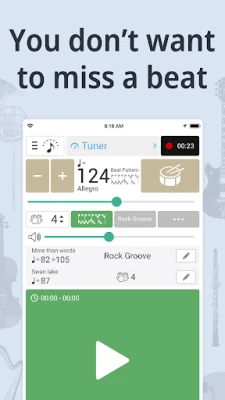 Šis rīks ietver arī iebūvētu ierakstītāju, kas ar vienu pieskārienu ļauj fiksēt jūsu spēli. Varat augšupielādēt savas nošu partitūras, praktizēt un ierakstīt, sekojot tām līdzi tieši lietotnē. Lietotne nodrošina atbalstu plašam instrumentu klāstam, ieskaitot klavieres, ģitāras, ukuleles, mandolīnas, vijoles, čellus, altas, basģitāras, bungas, flautas un harmonikas, kā arī transponētos instrumentus, piemēram, si bemol klarnetes vai fa ragi. Papildus tam pieejami mērogu vingrinājumi, precīza sitienu skaita (BPM) kontrole un detektors, kā arī prakses laika uzskaites funkcija, lai palīdzētu jums efektīvi attīstīt savas muzikālās prasmes.