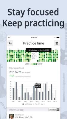 Šis rīks ietver arī iebūvētu ierakstītāju, kas ar vienu pieskārienu ļauj fiksēt jūsu spēli. Varat augšupielādēt savas nošu partitūras, praktizēt un ierakstīt, sekojot tām līdzi tieši lietotnē. Lietotne nodrošina atbalstu plašam instrumentu klāstam, ieskaitot klavieres, ģitāras, ukuleles, mandolīnas, vijoles, čellus, altas, basģitāras, bungas, flautas un harmonikas, kā arī transponētos instrumentus, piemēram, si bemol klarnetes vai fa ragi. Papildus tam pieejami mērogu vingrinājumi, precīza sitienu skaita (BPM) kontrole un detektors, kā arī prakses laika uzskaites funkcija, lai palīdzētu jums efektīvi attīstīt savas muzikālās prasmes.